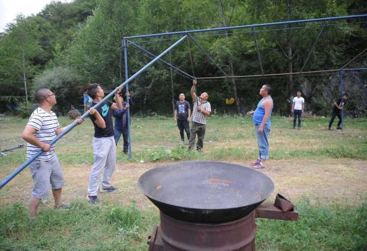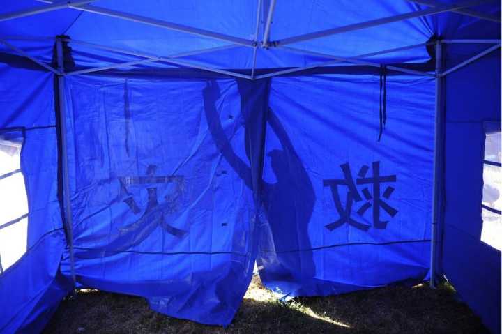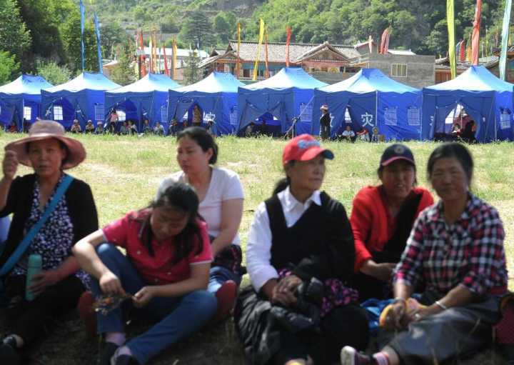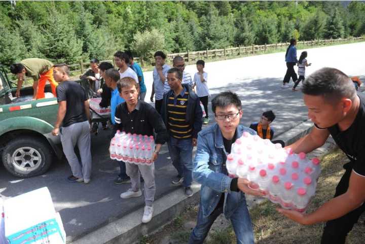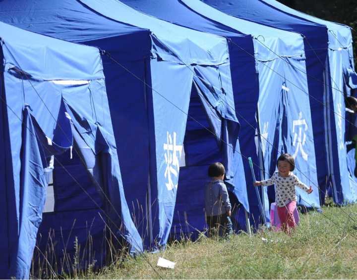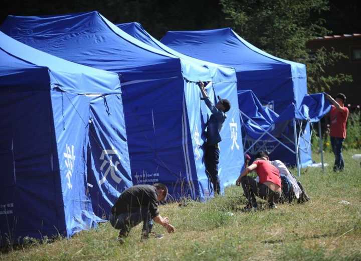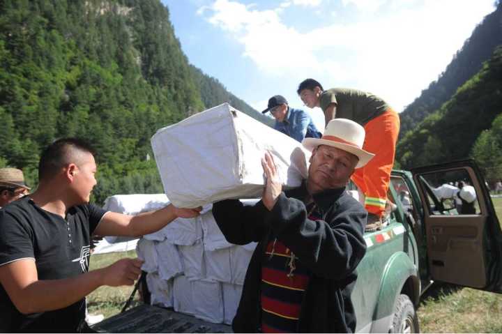 8月9日,九寨沟7.0级地震发生后,在九寨沟景区荷叶寨,村民们忙着搭建相关救灾单位提供的帐篷。空阔的草地上,今天又临时搭起了20多个帐篷。“帐篷搭好了,晚上好生火做饭。”一位村民说。 荷叶寨共有144户556人,全村人集资在村里开了两家副食品公司。当天,大家齐心协力从副食品公司拿出水、米、方便面等物资,一起生火做饭,不等不靠,开展互帮互救。(川报观察记者 肖雨杨 摄影报道)