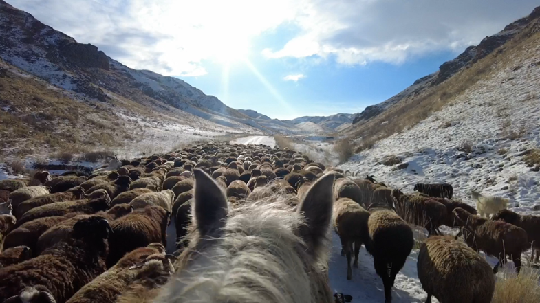 近日,新疆阿勒泰地区吉木乃县别斯铁热克乡加勒格孜喀拉尕依村的阿扎提·吐斯普汗,在弟弟的陪伴下,引领着家中200余只羊群,前往百里之外的冬季牧场。