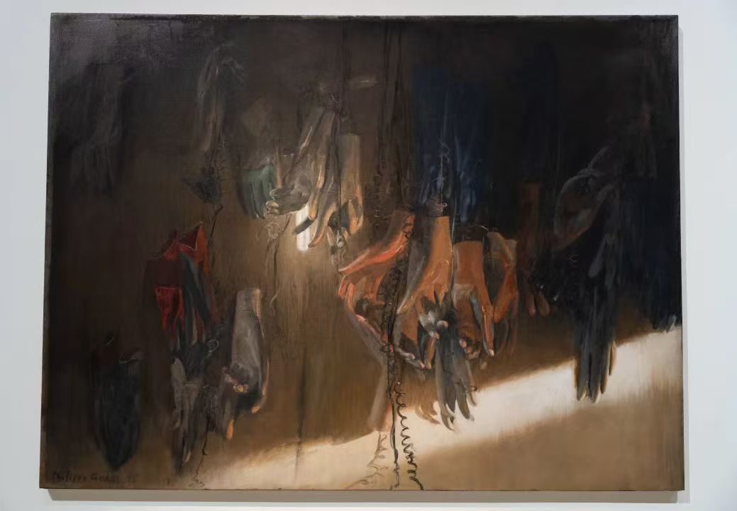 《画室的墙》创作于2015年,该件作品与19世纪德国画家阿道夫·门采尔的作品同名。不过在画面及构图上,菲利普·加莱尔均有变化:画面主体从符合人们对于画室想象的石膏模型,置换成了大量悬垂的手套,迥然不同于门采尔所塑造的昏黄安宁的画室,一个充满荒诞意味的空间呈现在观众眼前。正如菲利普·加莱尔所言:“我追求一种虚构的现实主义,一种梦幻般的绘画,但看起来却是真实的。为了达到这种真实的效果,我设计了非常复杂的场景”。