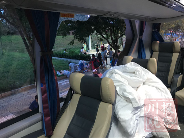 “地震发生后,我们坐大巴往酒店赶,突然间有块飞石砸进了后车窗,我就感觉突然被他抱住了,睁开眼睛才发现玻璃在脚下碎了一地,脚边还有块四个拳头那么大的石头”曾雅静激动的对记者说。当时车上一共29人,后车窗被碎石砸破后,导游和司机让大家到大巴的另一侧躲避,并用棉被塞住破损的玻璃,避免碎玻璃伤人。8月9日晚20点30分,全车人都安全回到成都。