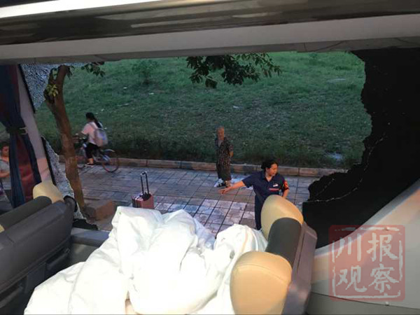 夜幕将至,这是九寨旅游团队返回成都动物园集散地的第16辆大巴。这辆大巴的后车窗被落石砸中,整块玻璃碎成一地,当时坐在这个窗边的是一对来自浙江的小情侣,女孩名叫曾雅静,是位老师,她和男朋友黄伟(化名)趁暑假来九寨沟玩。刚到九寨沟的第一天就发生了地震。