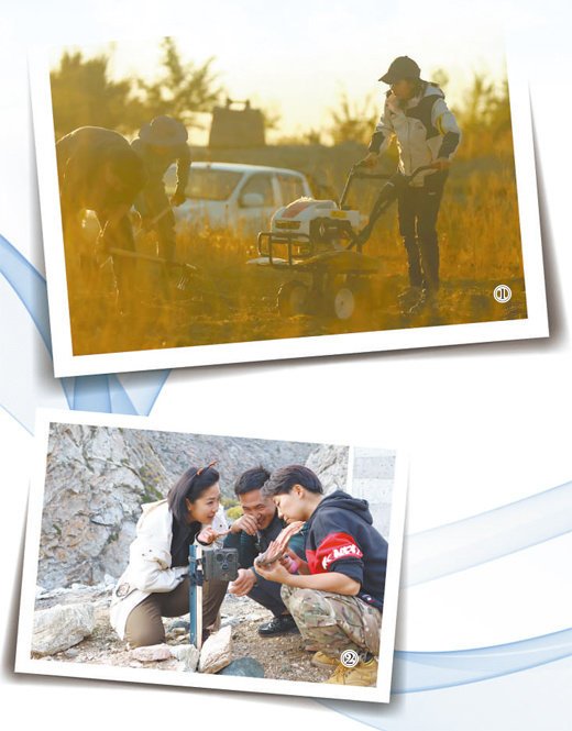 图①:初雯雯(右一)和工作人员一起在地里劳作。方通简摄