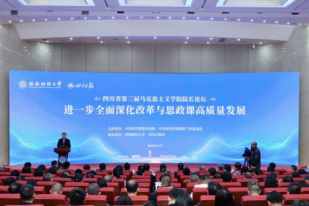 11月25日上午,由省委宣传部、省委教育工委主办,西南财经大学、四川日报社承办的四川省第三届马克思主义学院院长论坛在成都开幕。来自全国知名专家学者与省内外高校、党校以及社科研究机构马克思主义学院(思政教研部)的相关负责人汇聚一堂,将围绕“进一步全面深化改革与思政课高质量发展”主题开展理论研讨和深入交流。省委宣传部常务副部长高中伟出席论坛并讲话。四川省委教育工委、省教育厅、西南财经大学、四川日报报业集团负责同志出席。