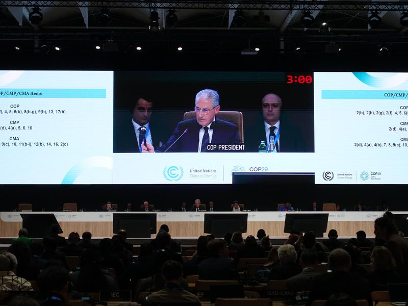 11月23日晚,在阿塞拜疆首都巴库,COP29主席、阿塞拜疆生态和自然资源部长穆赫塔尔·巴巴耶夫就一项决议通过敲锤。新华社记者 安晓萌 摄