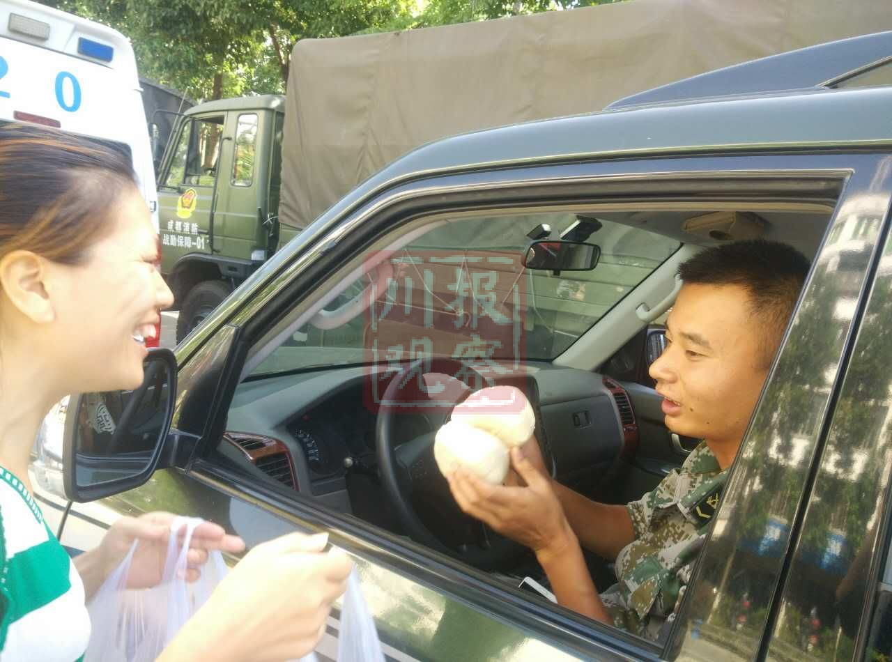 “你们辛苦了!来吃个馒头……”8月9日上午10时,梯队经过平武县南坝镇时,一位40岁左右的大姐端着一大筐馒头不停地往军车车厢内递。
