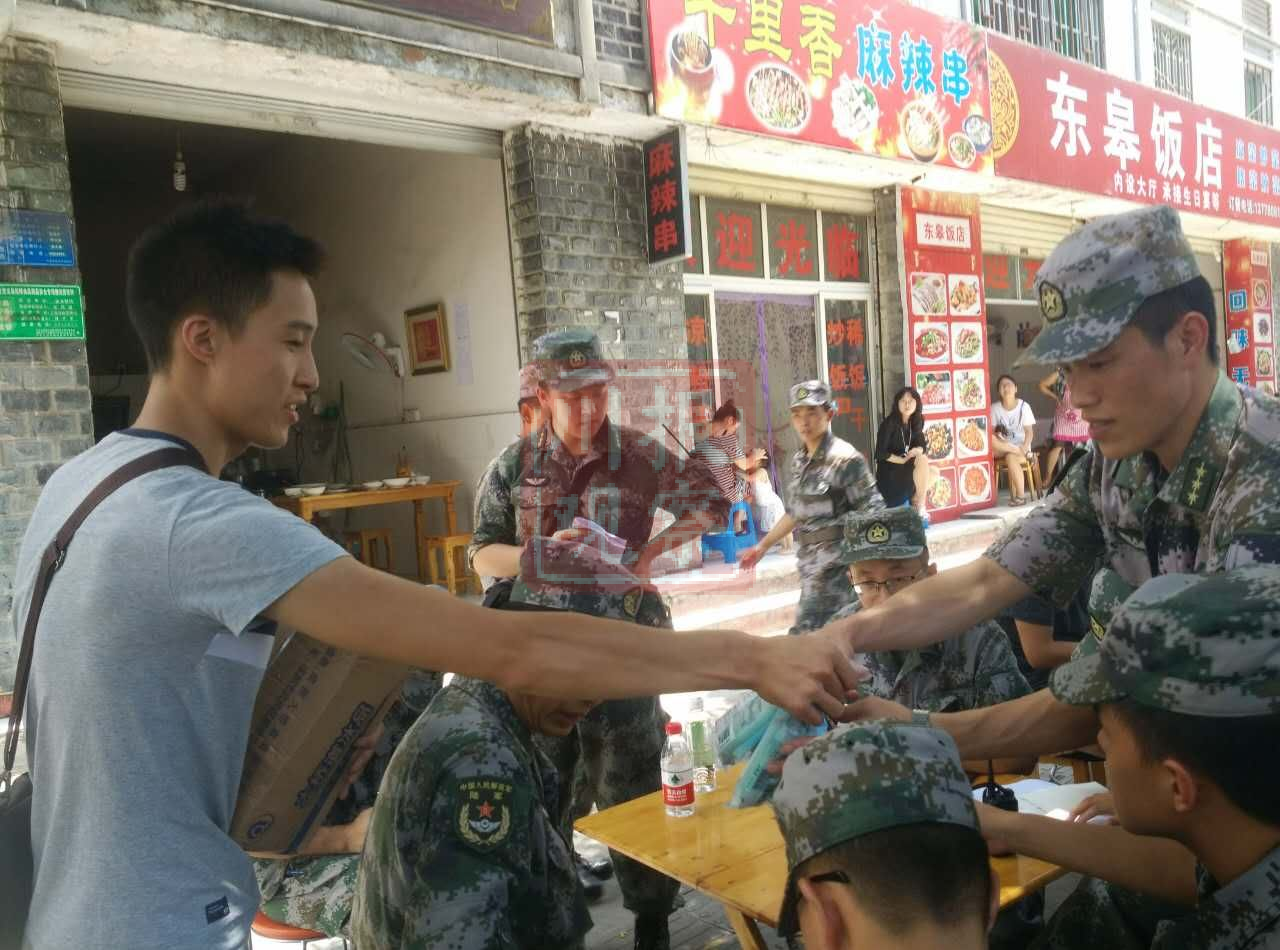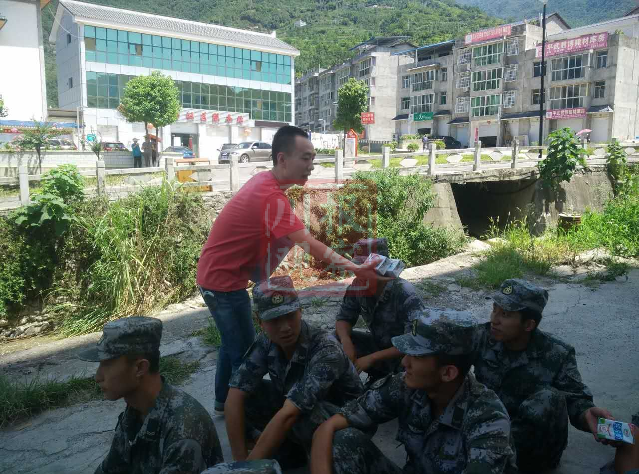车队行至平武县县城时,由于大量游客往外涌,导致道路造成了一定程度的拥堵。烈日炙烤下,很多官兵在车厢内汗流浃背。见此情景,一群志愿者买来几箱冰棍和牛奶,准备分发给官兵祛暑解乏。见有的战士不肯收下,年轻的志愿者们竟着急的不知道说什么:“你们就是我们的恩人,天气这么热,快点解解暑……”说着说着,一个劲地往官兵手里塞。