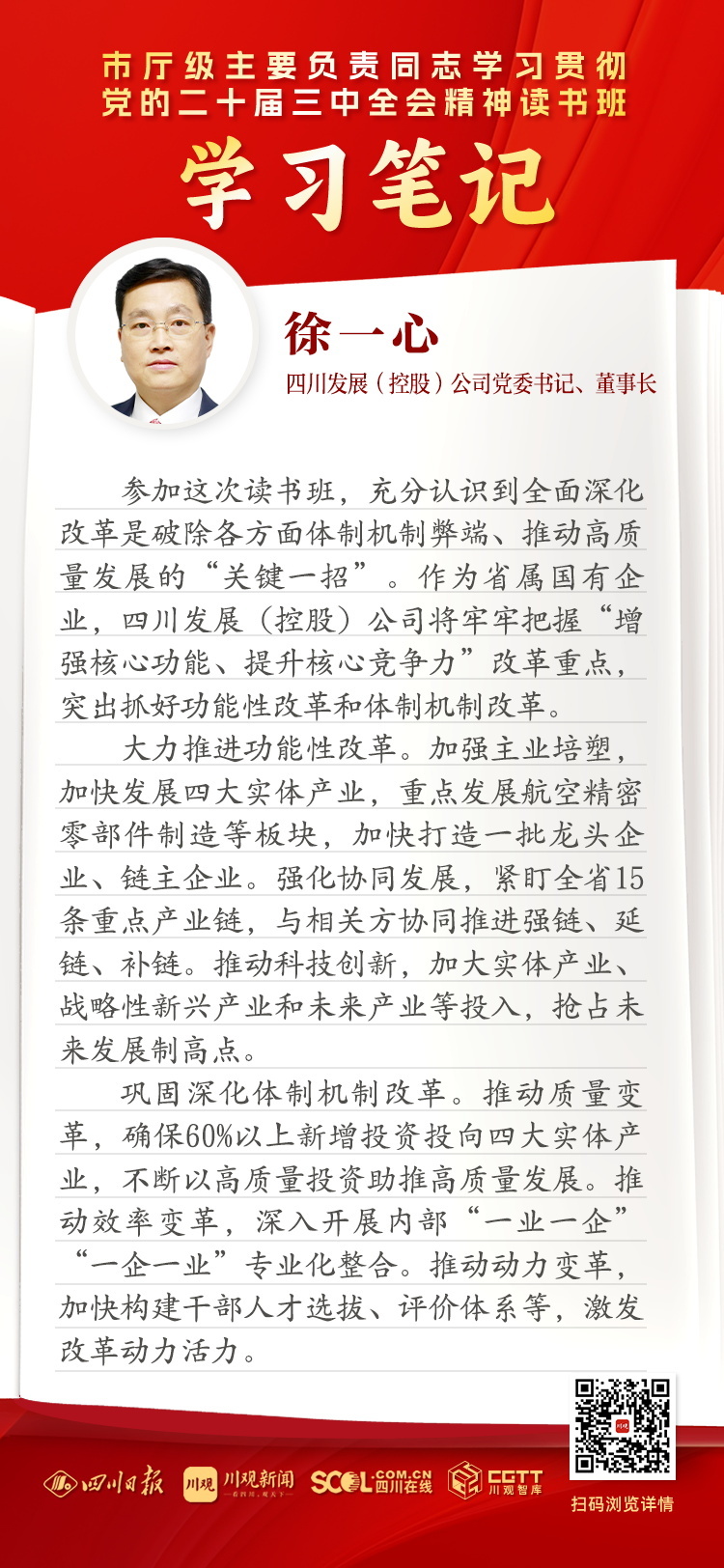 参加这次读书班,充分认识到全面深化改革是破除各方面体制机制弊端、推动高质量发展的“关键一招”。作为省属国有企业,四川发展(控股)公司将牢牢把握“增强核心功能、提升核心竞争力”改革重点,突出抓好功能性改革和体制机制改革。
