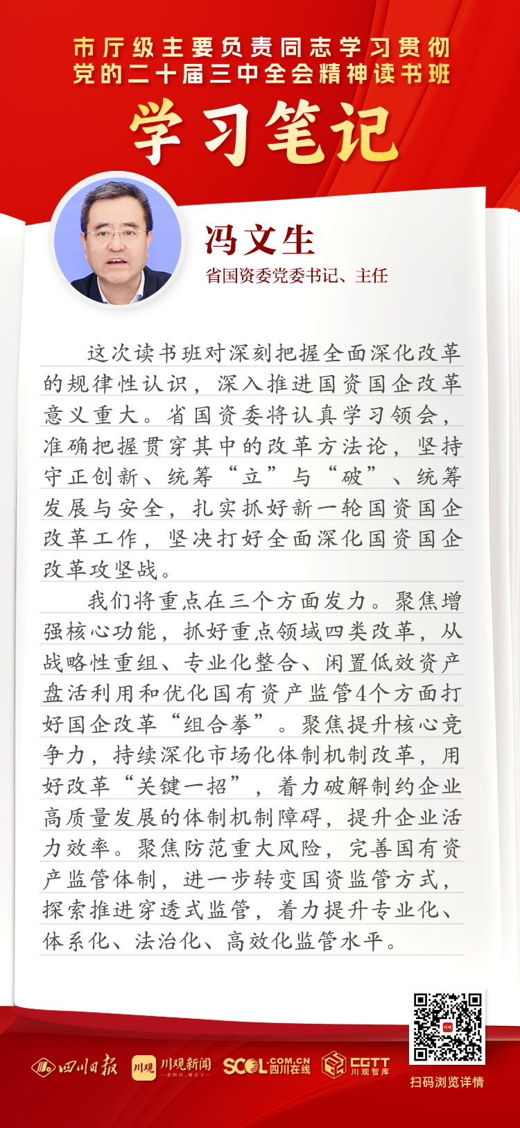 这次读书班对深刻把握全面深化改革的规律性认识,深入推进国资国企改革意义重大。省国资委将认真学习领会,准确把握贯穿其中的改革方法论,坚持守正创新、统筹“立”与“破”、统筹发展与安全,扎实抓好新一轮国资国企改革工作,坚决打好全面深化国资国企改革攻坚战。