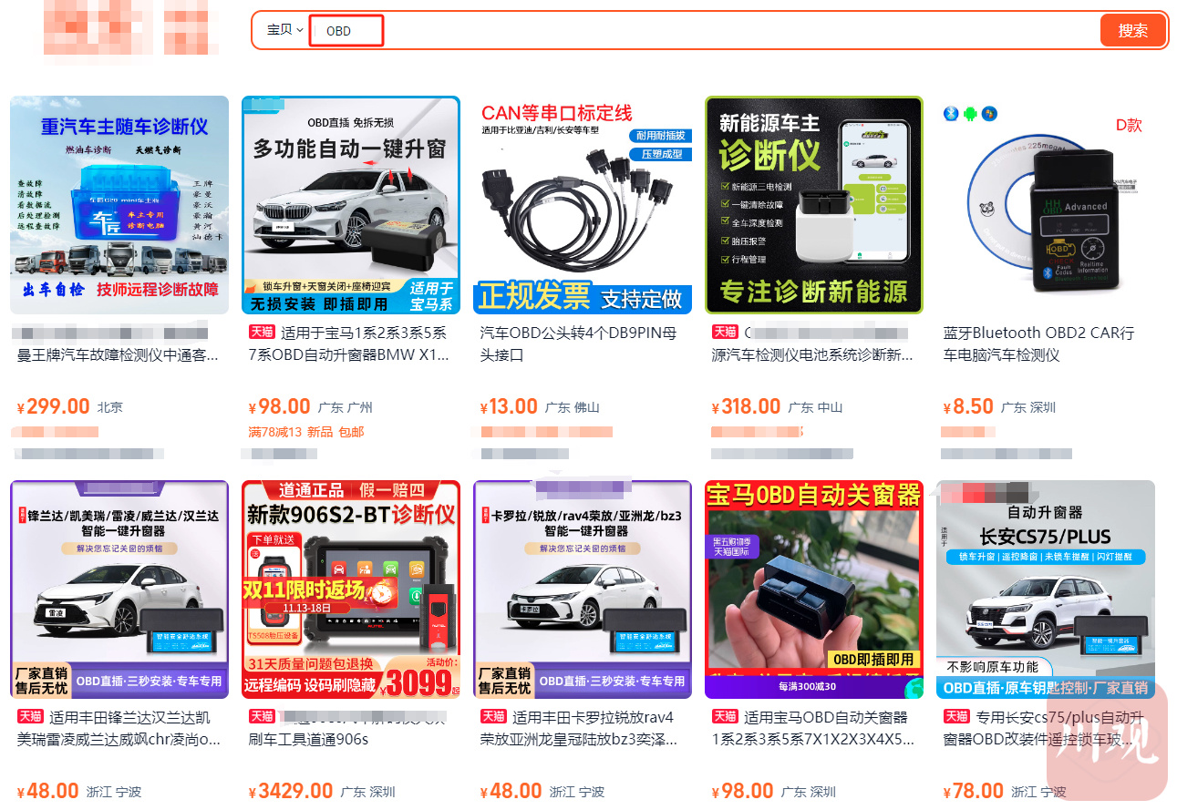 电商平台上OBD设备销售截图。