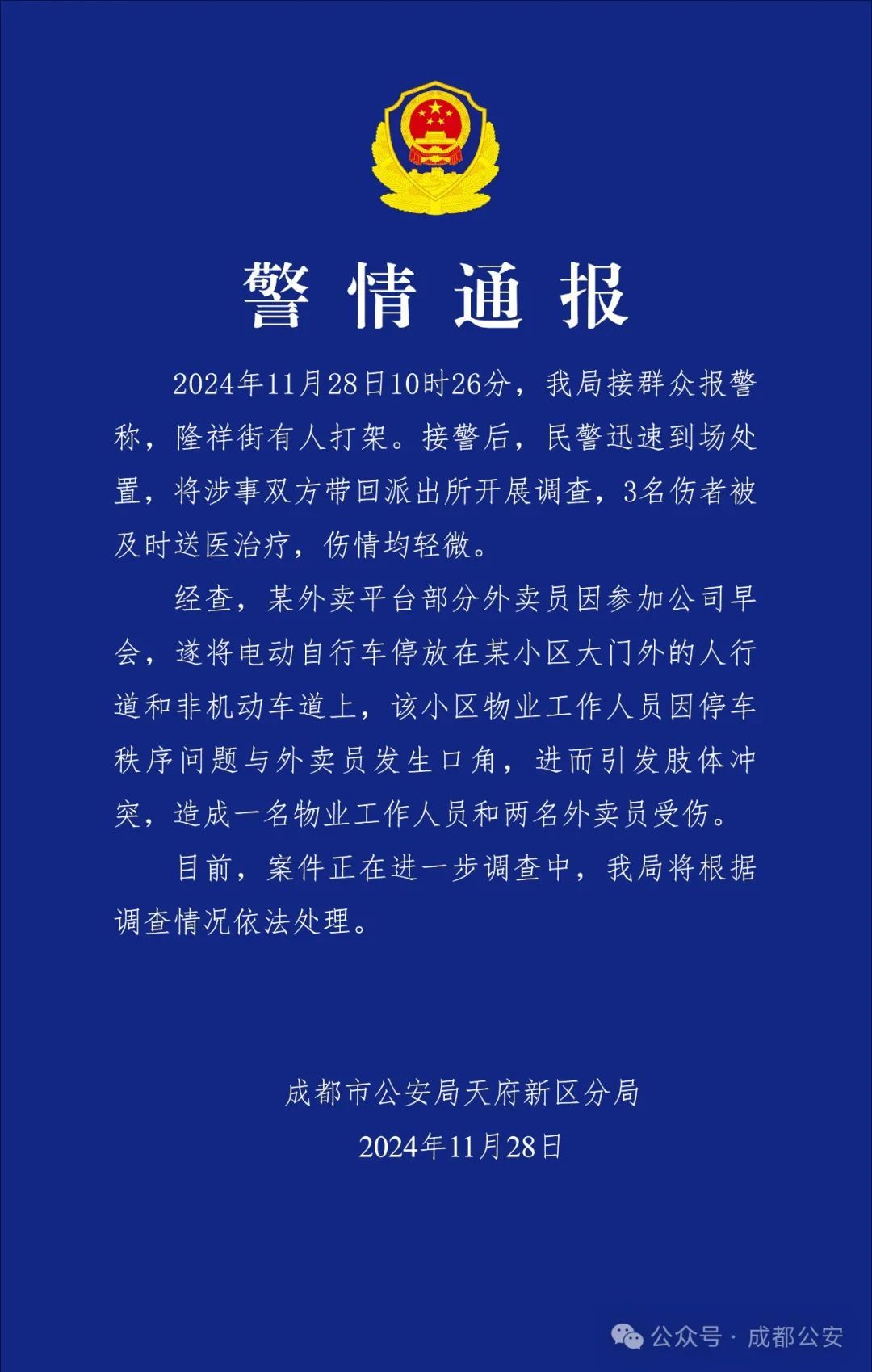 2024年11月28日,成都市公安局天府新区分局发布警情通报: