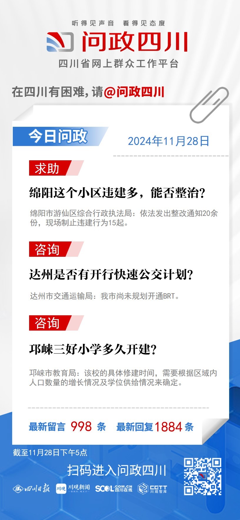 在四川有困难,找问政四川。如果您在四川遇到了操心事、烦心事、揪心事,请登录“四川省网上群众工作平台—问政四川”或拨打问政四川热线(028-96001)留言反映、求助或建议。我们将充分发挥平台的互动联系作用及舆论监督功能,第一时间传递民声,推动问题得以及时解决——听得见声音,看得见态度。
