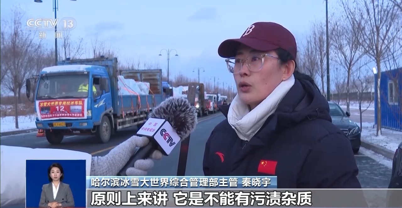 哈尔滨冰雪大世界综合管理部主管 秦晓宇:我们首先要看冰的透光度,原则上讲,不能有污渍杂质或者明显的污壳,才能够给广大游客呈现一个美轮美奂的冰雪大世界。