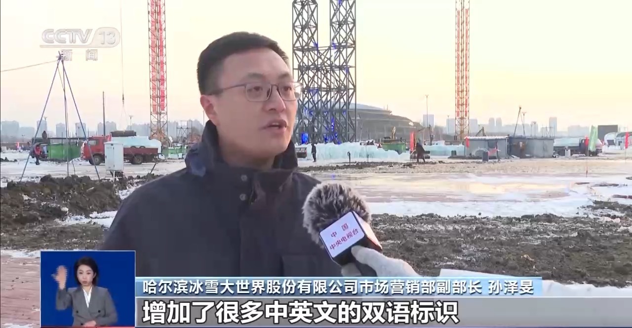 哈尔滨冰雪大世界股份有限公司市场营销部副部长 孙泽旻:增加了很多中英文的双语标识,同时增加了英文的导游导览服务。为了方便外国游客可以在园区内购票,增加了可以识别护照、识别国际支付的支付系统和购票系统。