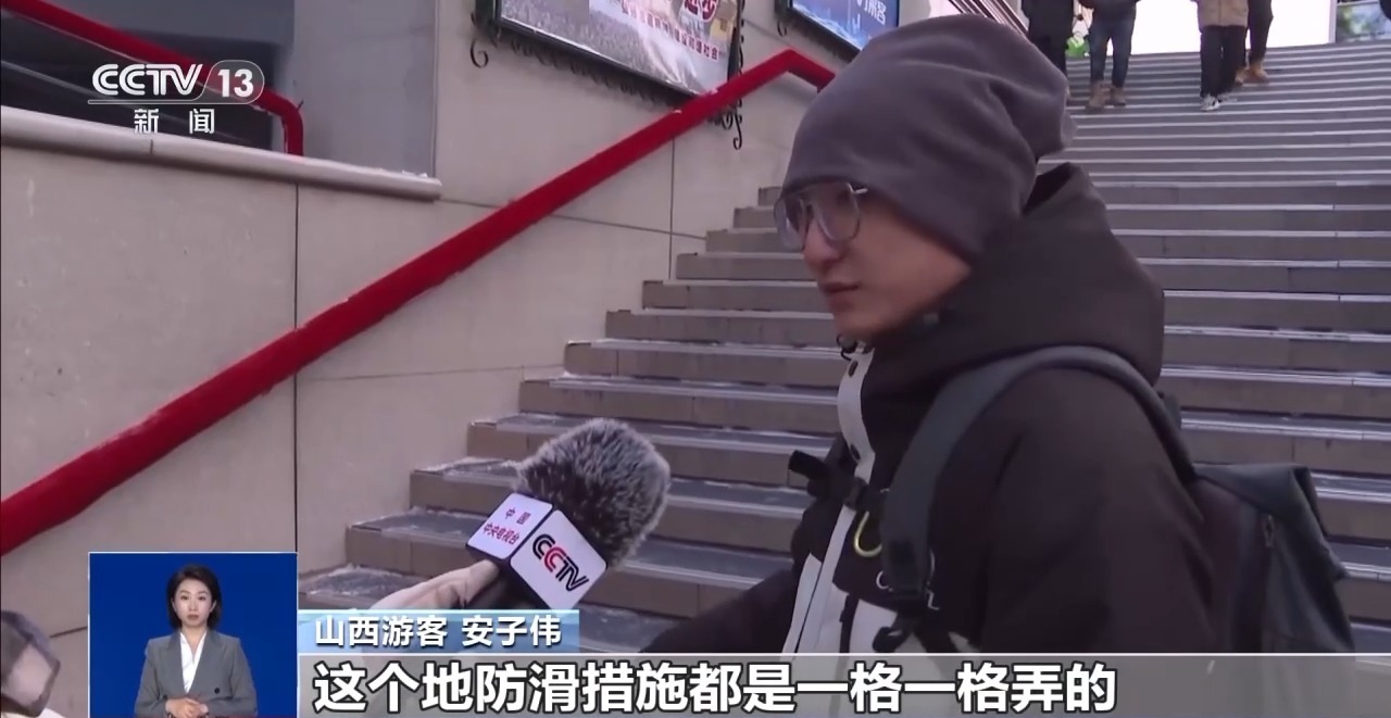 山西游客 安子伟:这个地防滑措施都是一格一格弄的,有橡胶还有铝合金。扶手也做了一些保暖措施,不管是旅游相关人员,还是哈尔滨的市民,对我们都很热情,东北人热情“嘎嘎的”。