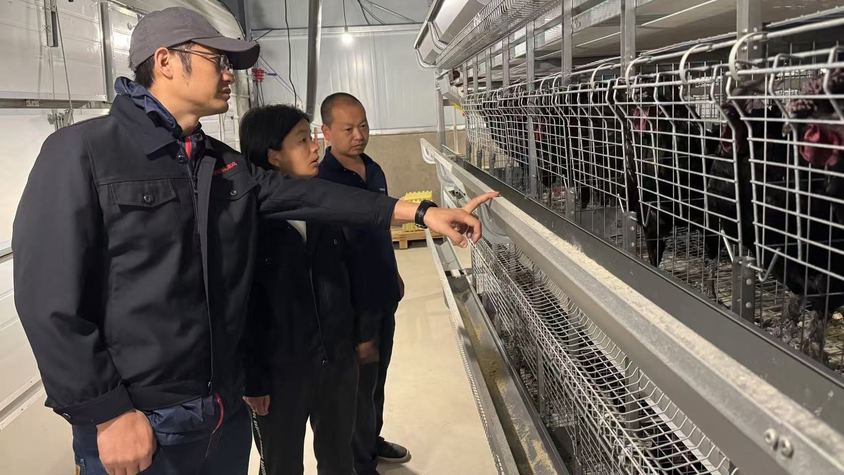 在棉麻集团投资建设的万源黑鸡全产业链生产基地内,舒刚(左一)提供技术指导。裴玉松 摄