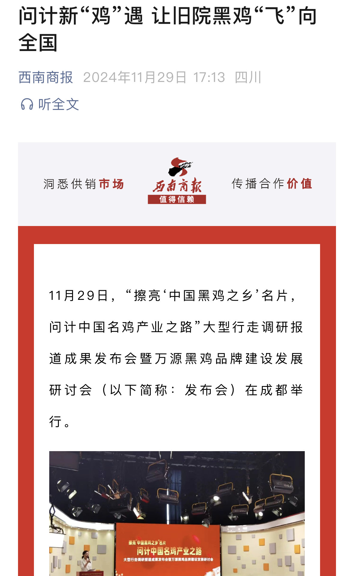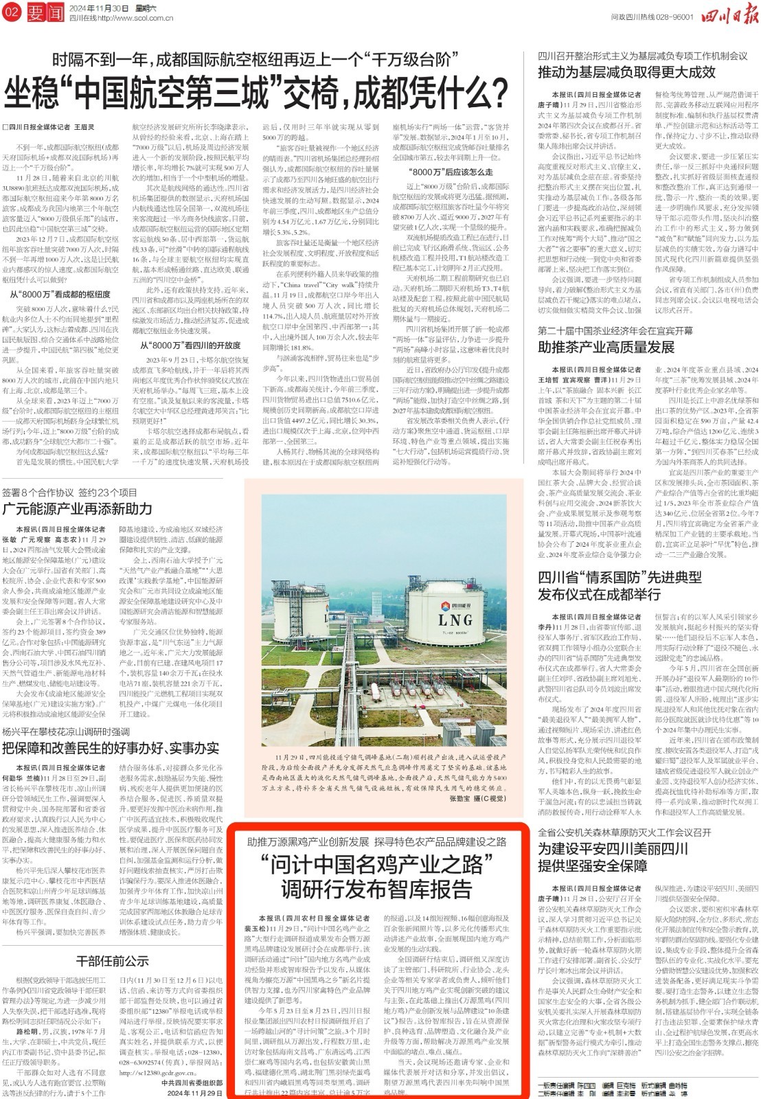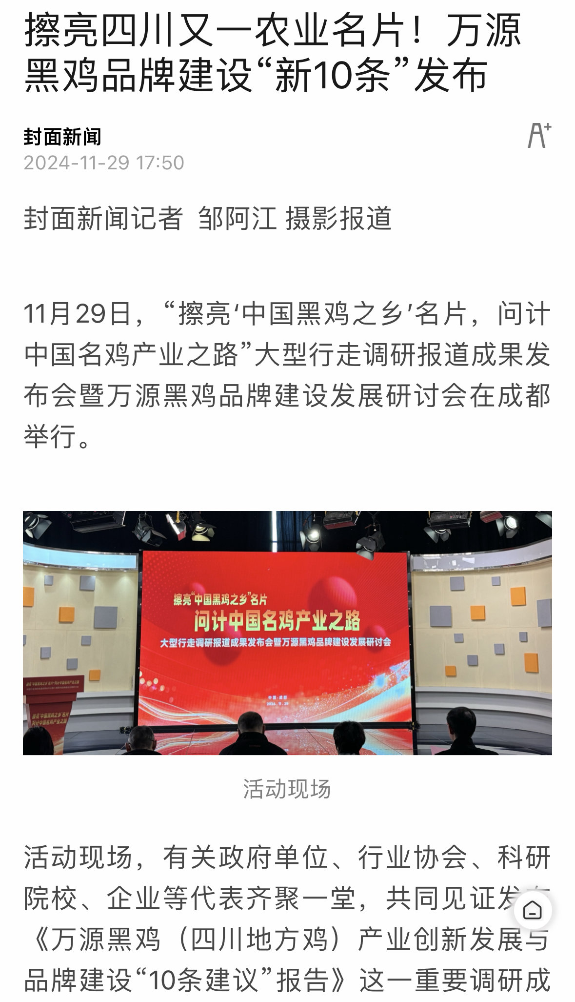 11月29日,“问计中国名鸡产业之路”大型行走调研报道成果发布会暨万源黑鸡品牌建设发展研讨会在成都举行。