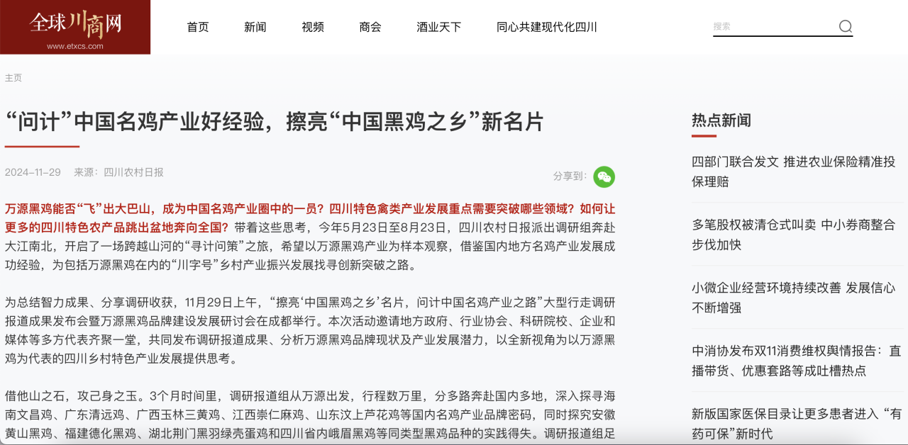 该调研活动通过“问计”国内地方名鸡产业成功经验并形成智库报告予以发布,从媒体视角为擦亮万源“中国黑鸡之乡”新名片提供智力支撑,也为四川家禽特色产业品牌建设提供了新思考。