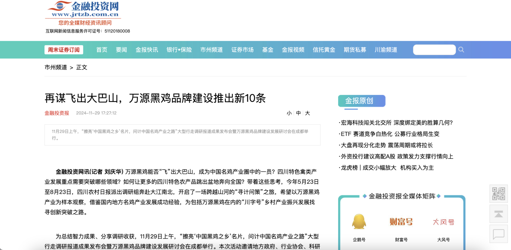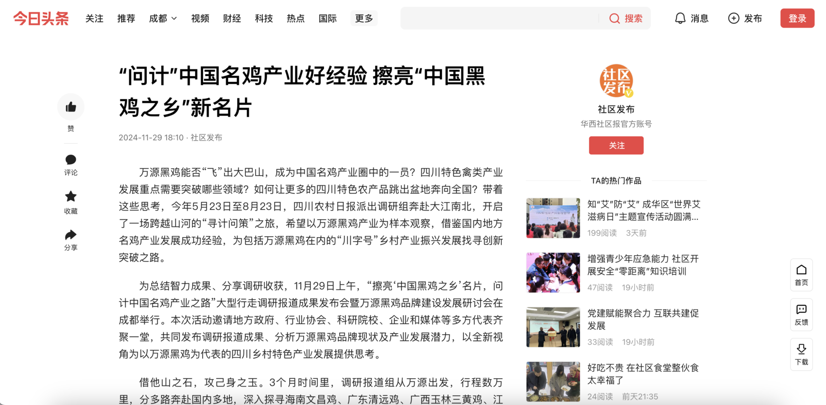 截至11月30日,该活动已在中国新闻网、四川日报、川观新闻、封面新闻、华西社区报、全球川商网、金融投资报、西南商报等中省主流媒体及新媒体平台刊发稿件10余篇,阅读量超过100万+,引发网友广泛讨论和点赞。