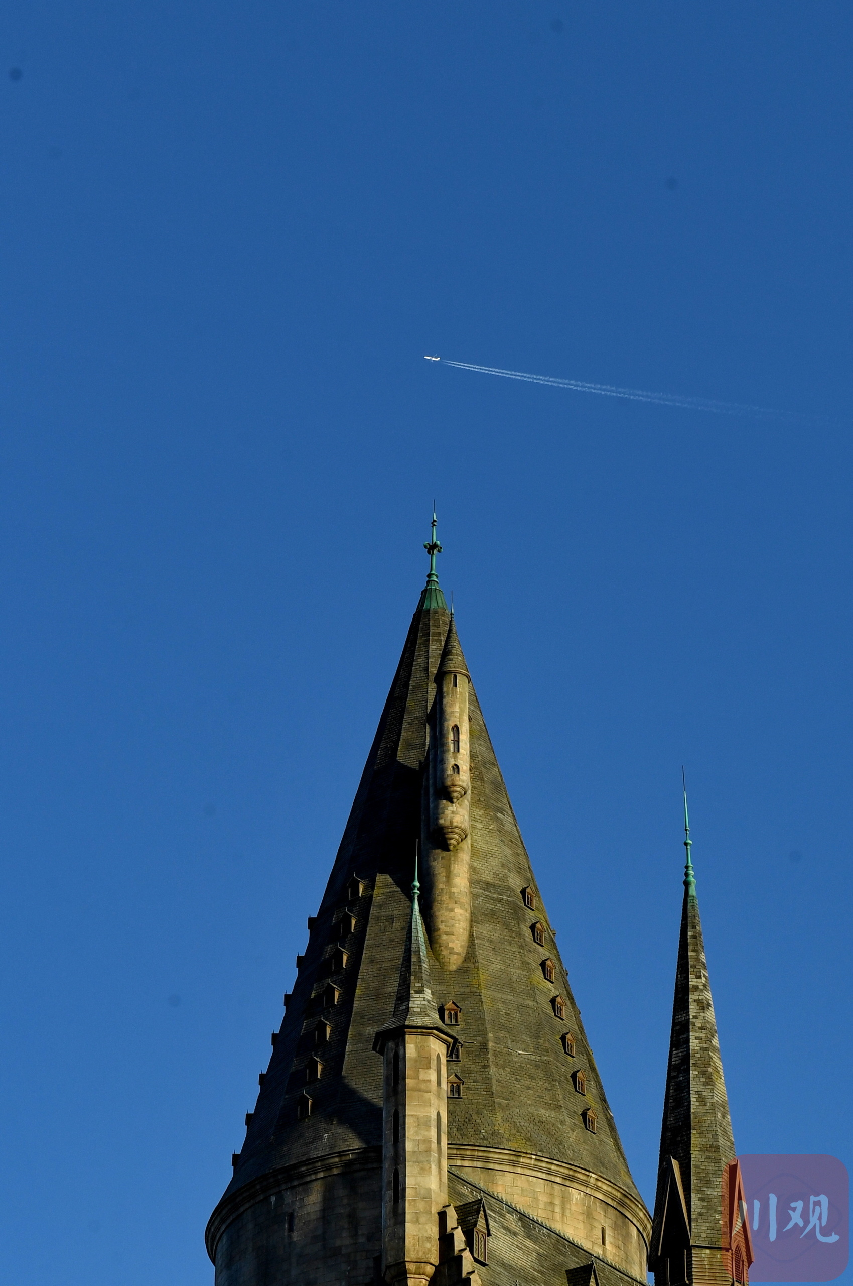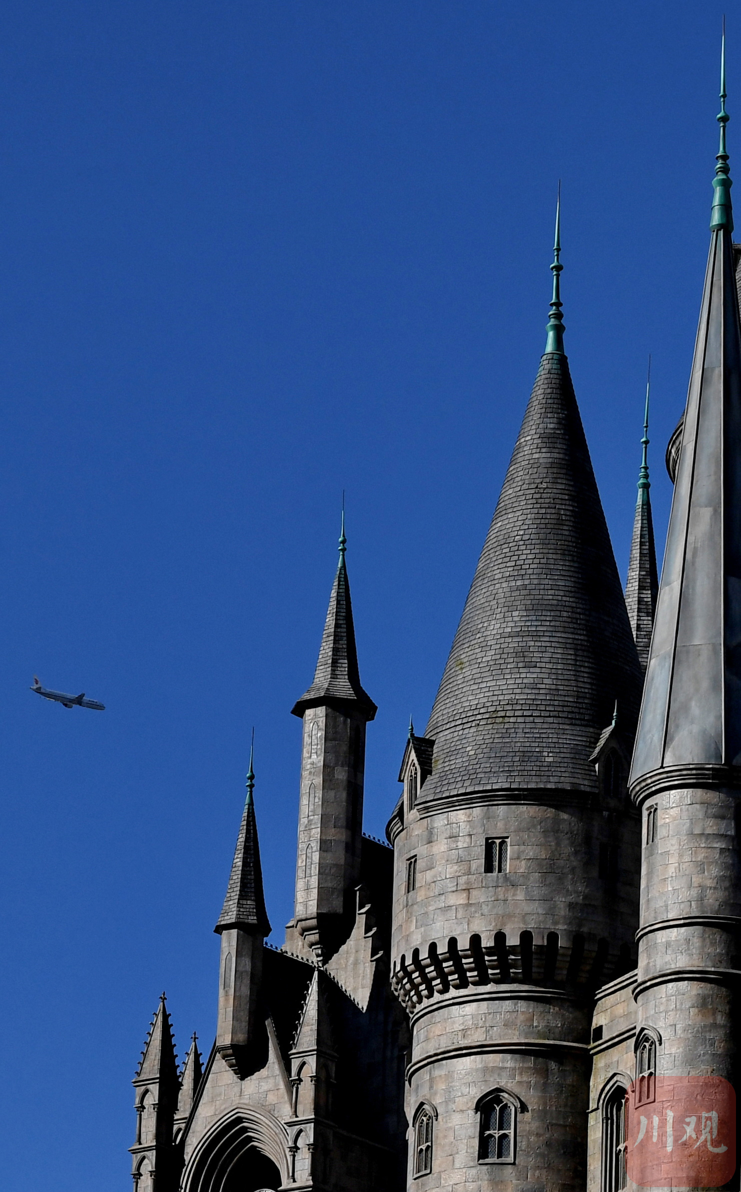 位于北京的建筑物与空中的飞机在“北京蓝”的映衬下美不胜收。