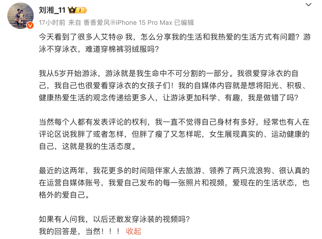 刘湘在回应中称,“今天看到了很多人艾特我,怎么分享我的生活和我热爱的生活方式有问题?游泳不穿泳衣,难道穿棉裤羽绒服吗?”