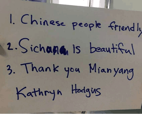 “Thank you mianyang.”今日下午3时许,九寨沟震区转往绵阳市中心医院治疗的加拿大游客Kathryan,经过出院前的系列检查后,医院认为可以出院,出院前,Kathryan在病床上用英语在稿签纸上写下:Chinese people friendly;Sichuan is beautiful;Thank you mianyang.(中国朋友很友好,四川依旧美丽,谢谢你,绵阳!)