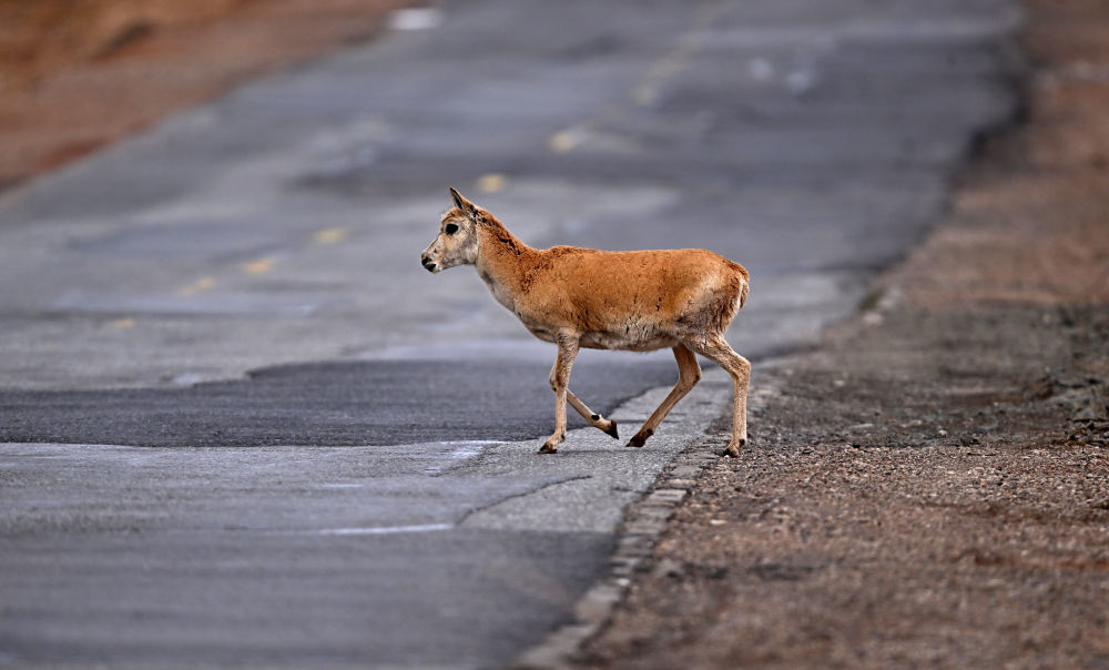 在可可西里,一只雌性待产藏羚羊通过青藏公路(2023年5月28日摄)。新华社记者 张宏祥 摄