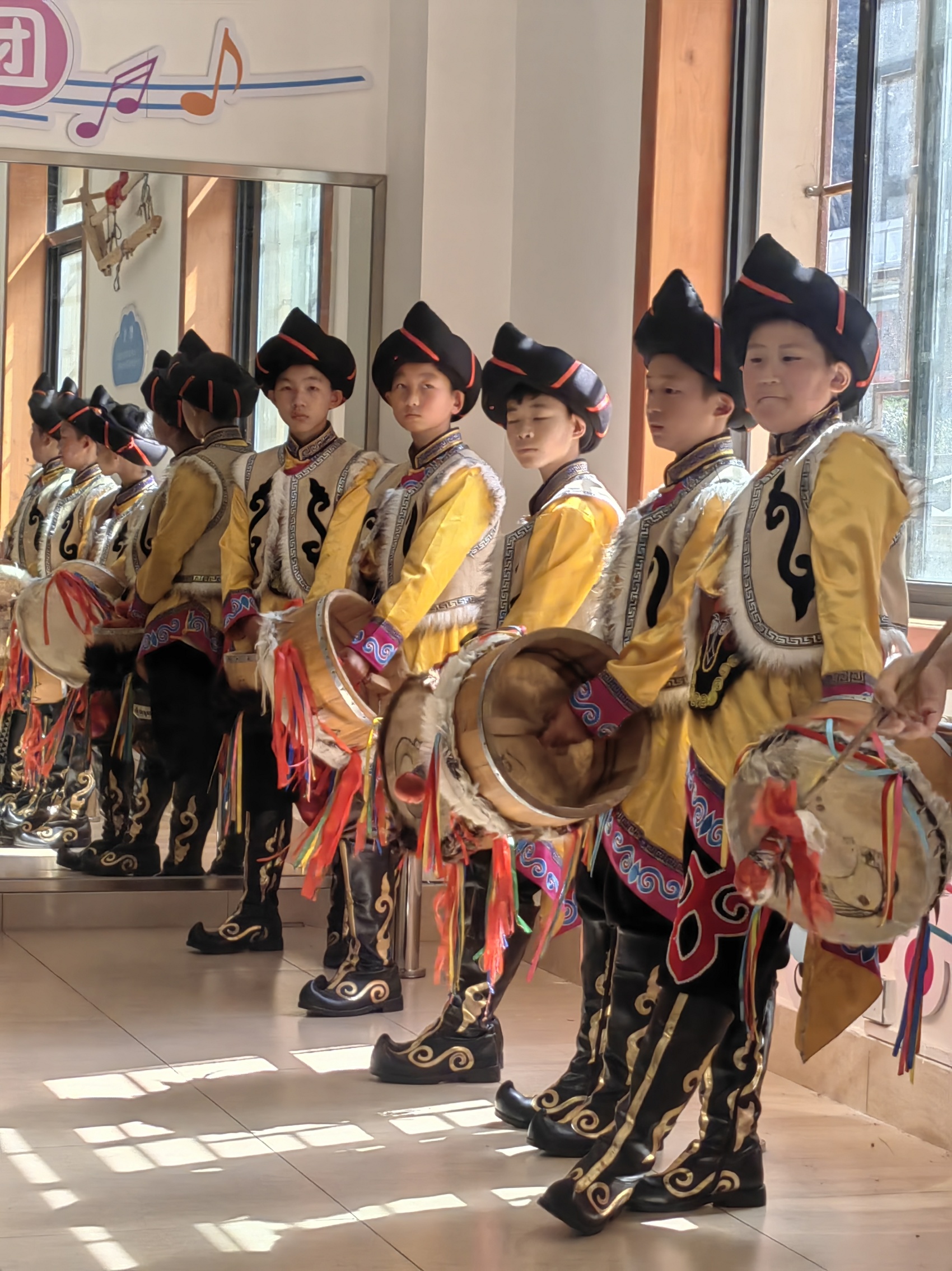 在相邻的灞州镇小学,我们见到了在这里快乐学习的孩子们。他们围住我们,个个笑脸喜人,虎虎有生气。音乐教室兼做羌族童声合唱团的排练场所,前方有舞台,旁边堆放着各种乐器,屋角有钢琴,墙上有五线谱教学提示,纪律要求和课程表也赫然在目。孩子们随着老师的口令给我们表演了羌族舞蹈,服装齐整、鼓点有力、动作熟练,训练有素。在这样的时代,孩子们不论处于何地,他们的艺术训练都已经纳入正规的教育轨道。
