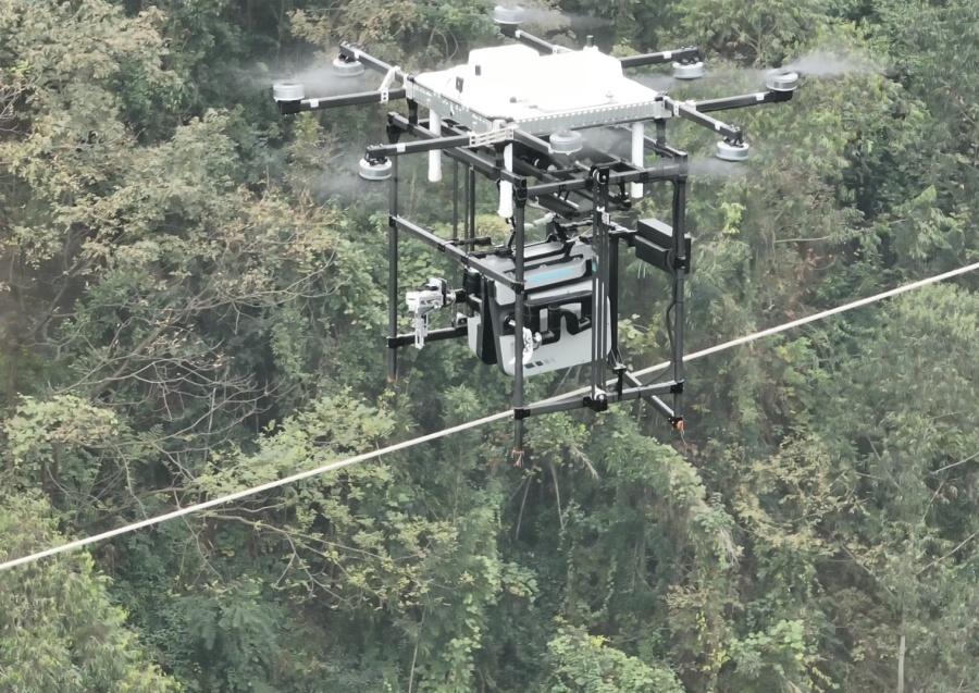 无人机将地线修补机器人吊至高空,成功挂上地线。随后,在供电员工的精准操控下,机器人平稳地向故障处前进。11月28日,国网乐山供电公司首次应用“无人机+地线断股修补机器人”对输电线路进行修补,进一步提升设备运维智能化水平。