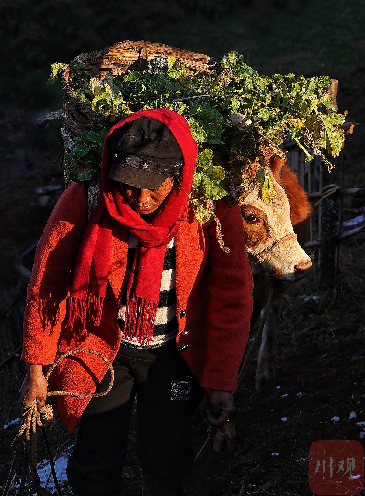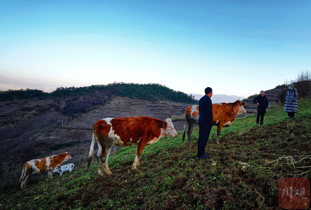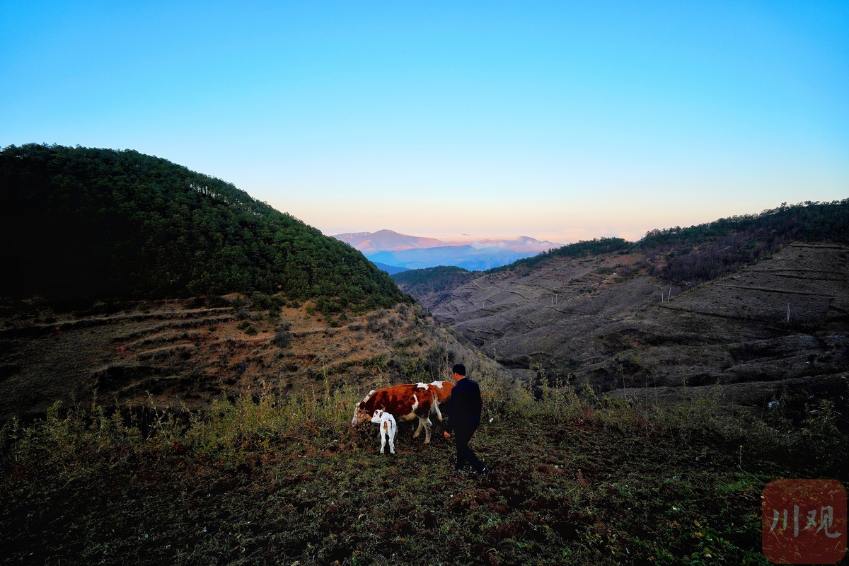 12月17日,昭觉县解放乡火普村,阿勒吃作追牛的时候,太阳正斜斜地挂在山腰上。追上了牛,他心情放松下来,跟记者讲起了买牛的故事。