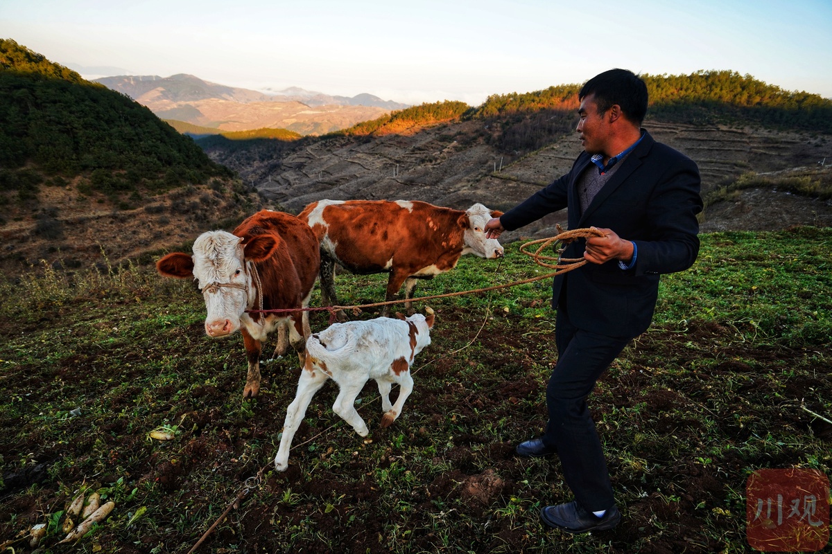 火普村海拔高,土地贫瘠,种土豆、荞麦一年收入不到千元,看到有人养西门塔尔牛,长得快、肉价高,母牛下了小牛,养两三个月就能卖到800元,阿勒吃作心动了。