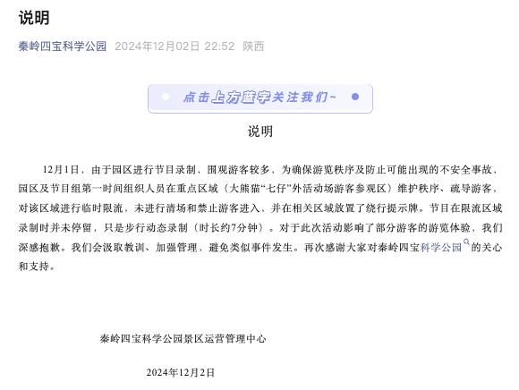 12月1日,在陕西西安秦岭四宝科学公园,一档综艺节目的录制导致部分游客未能如愿见到大熊猫七仔,引发游客不满。有网友发布视频质疑园方给予综艺节目组特权。陕西秦岭四宝科学公园景区运营管理中心12月2日发布说明称,“12月1日,由于园区进行节目录制,围观游客较多,为确保游览秩序及防止可能出现的不安全事故,园区及节目组第一时间组织人员在重点区域(大熊猫“七仔”外活动场游客参观区)维护秩序、疏导游客,对该区域进行临时限流,未进行清场和禁止游客进入,并在相关区域放置了绕行提示牌。节目在限流区域录制时并未停留,只是步行动态录制(时长约7分钟)。对于此次活动影响了部分游客的游览体验,我们深感抱歉。”