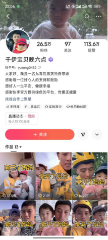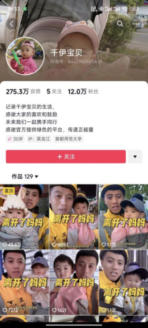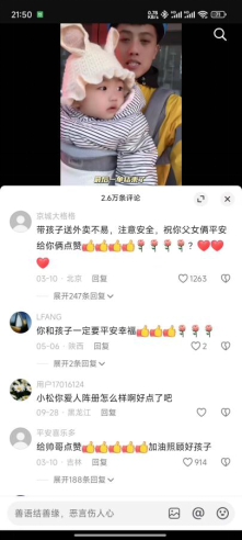 视频中抱着孩子的外卖骑手父亲“小松”正讲述着今天的故事,评论区来自叔叔阿姨的关心和高达43万的点赞使“小松”充满了“创作热情”,“小松”已经在各类平台发布了百余条短视频,个人主页中充满了“离开了妈妈”等字样。靠着发布自己和女儿一起送外卖的视频,“小松”已经在各类网络平台积累了40余万粉丝,也在直播带货中取得了收益。