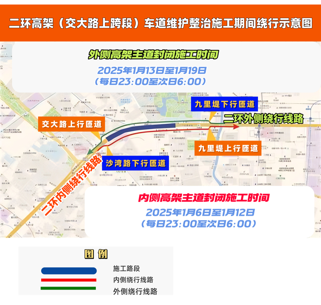 2025年1月13日至1月19日(每日23:00至次日6:00),二环高架路交大跨线桥外侧高架主道封闭施工,禁止机动车通行。详见下图: