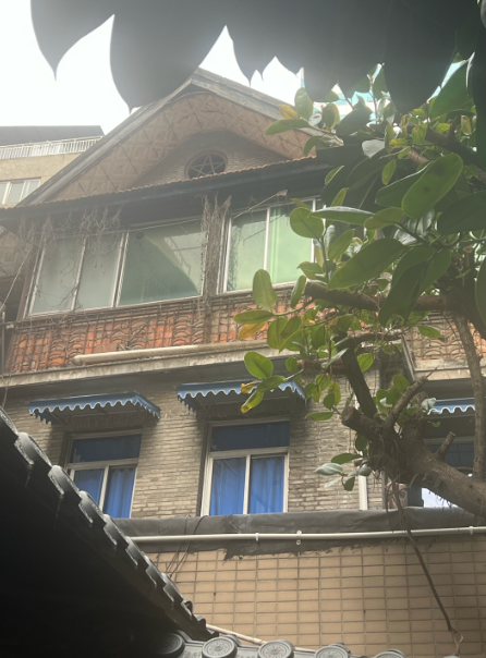 这座三层砖木结构的阁楼,占地760平方米,是典型的近代公馆式建筑,风格偏向欧式。阁楼正面最上方有个显著的五角星样式,淡黄色的瓦片撑起了三角形的屋顶,窗前有些杂草。楼上的窗户和门是中式风格,呈棕红色,远远望去古朴却十分独特。