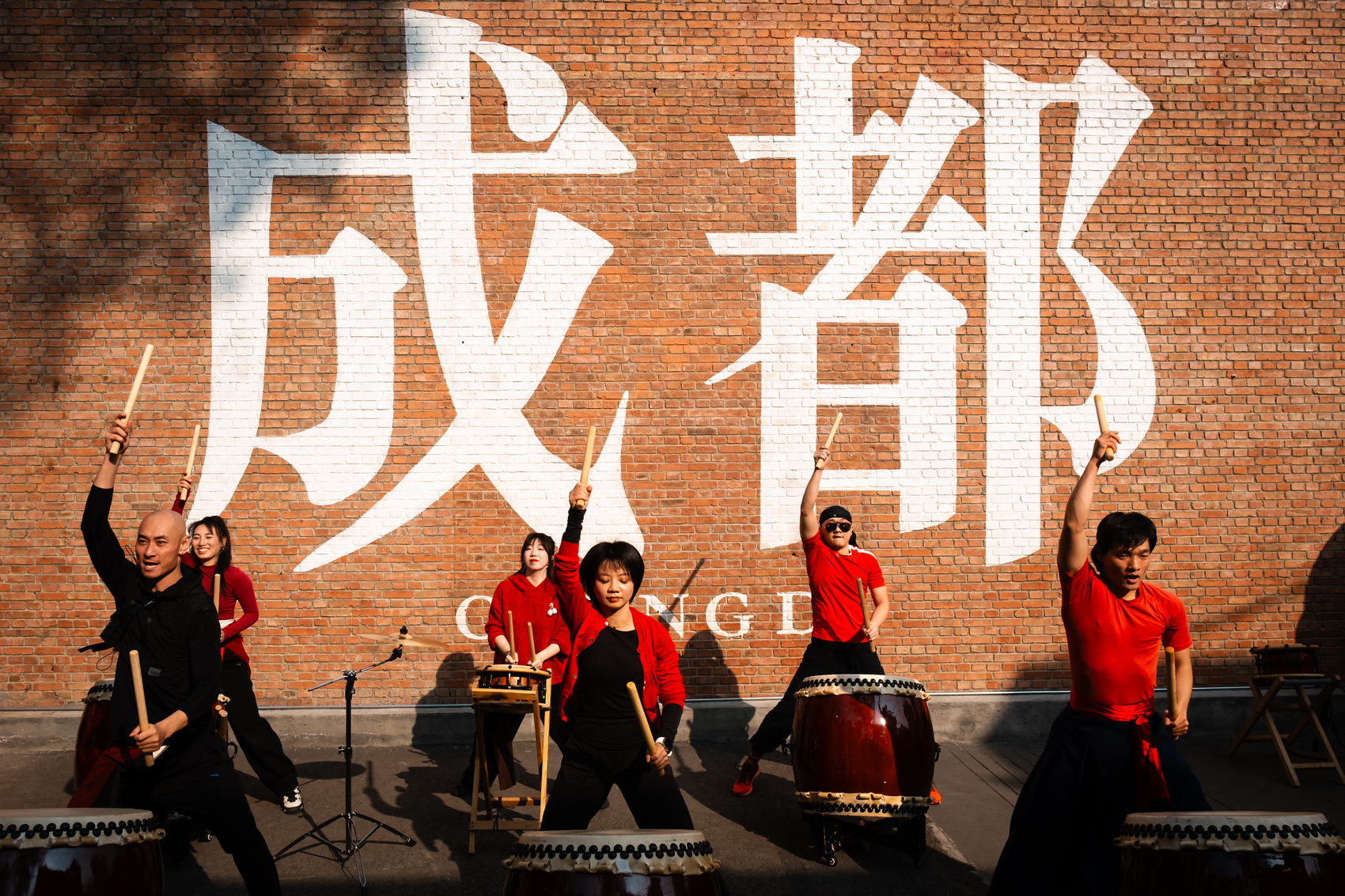 2024年大年初一,在写有“成都”二字的红墙下,鼓手们腰间围着外套,精神抖擞。站在中间的鼓手大吼一声,另几位鼓手随声应下,鼓棒在鲜红的牛皮鼓上敲出隆隆声。许多游客循着鼓声而来,不一会儿就里三层外三层地把鼓队“包围”起来,沉浸式体验这一“年味十足”的鼓乐。这是成都“东郊新春HiiKO世界节奏音乐汇”的演出现场,火热程度可见一斑。