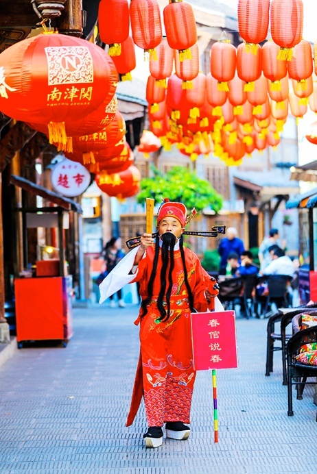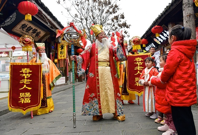 春节期间徜徉阆中古城,你会发现,大街小巷中,有一些身着红色汉服、手执竹筒或赐福的旗幌、白须白发的老人,迎着鞭炮声、锣鼓声,笑意盈盈地向市民、游客拜年、赐福。他们就是“春节老人”落下闳的化身。他们的出现,让古城充满人情味,也让更多游客记住了“春节老人”和阆中。