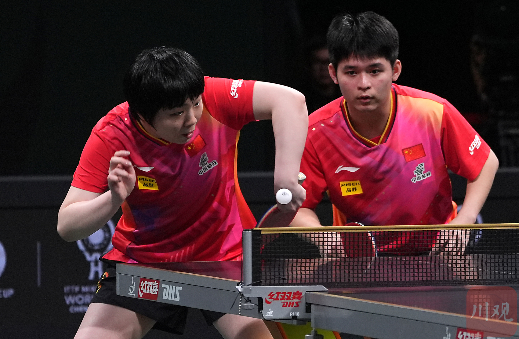 混双组合林诗栋/蒯曼(红衣)在比赛中。