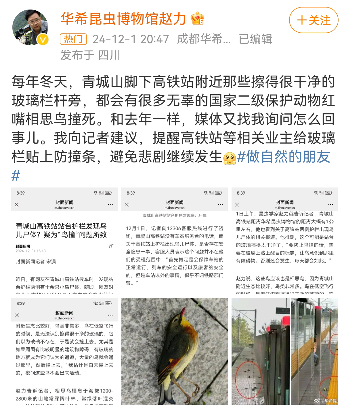 成都华希昆虫博物馆馆长、昆虫学家赵力在其社交媒体中透露,“每年冬天,青城山脚下高铁站附近那些擦得很干净的玻璃栏杆旁,都会有很多无辜的国家二级保护动物红嘴相思鸟撞死。”
