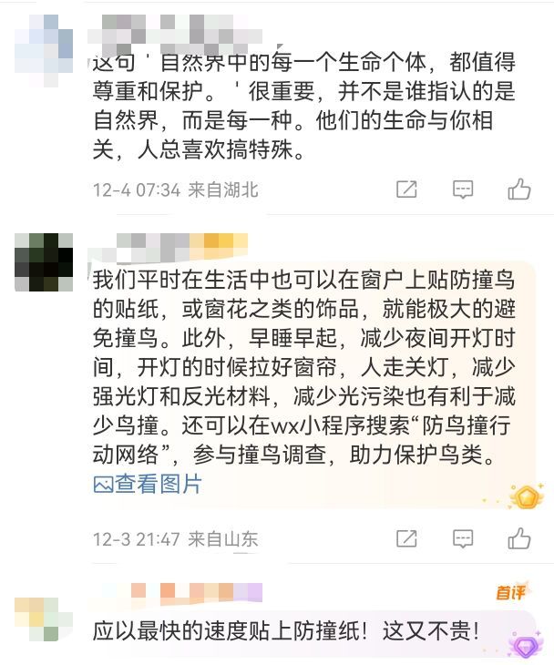 也有网友建议,在玻璃表面贴上纹理或者安装隔离网,以减少玻璃的透明度和反光性,帮助鸟类更好地识别障碍物。还要加强研究,通过改变建筑外观材质和形状,减少鸟类与玻璃之间的“误解”和冲突,或者更换玻璃材质。