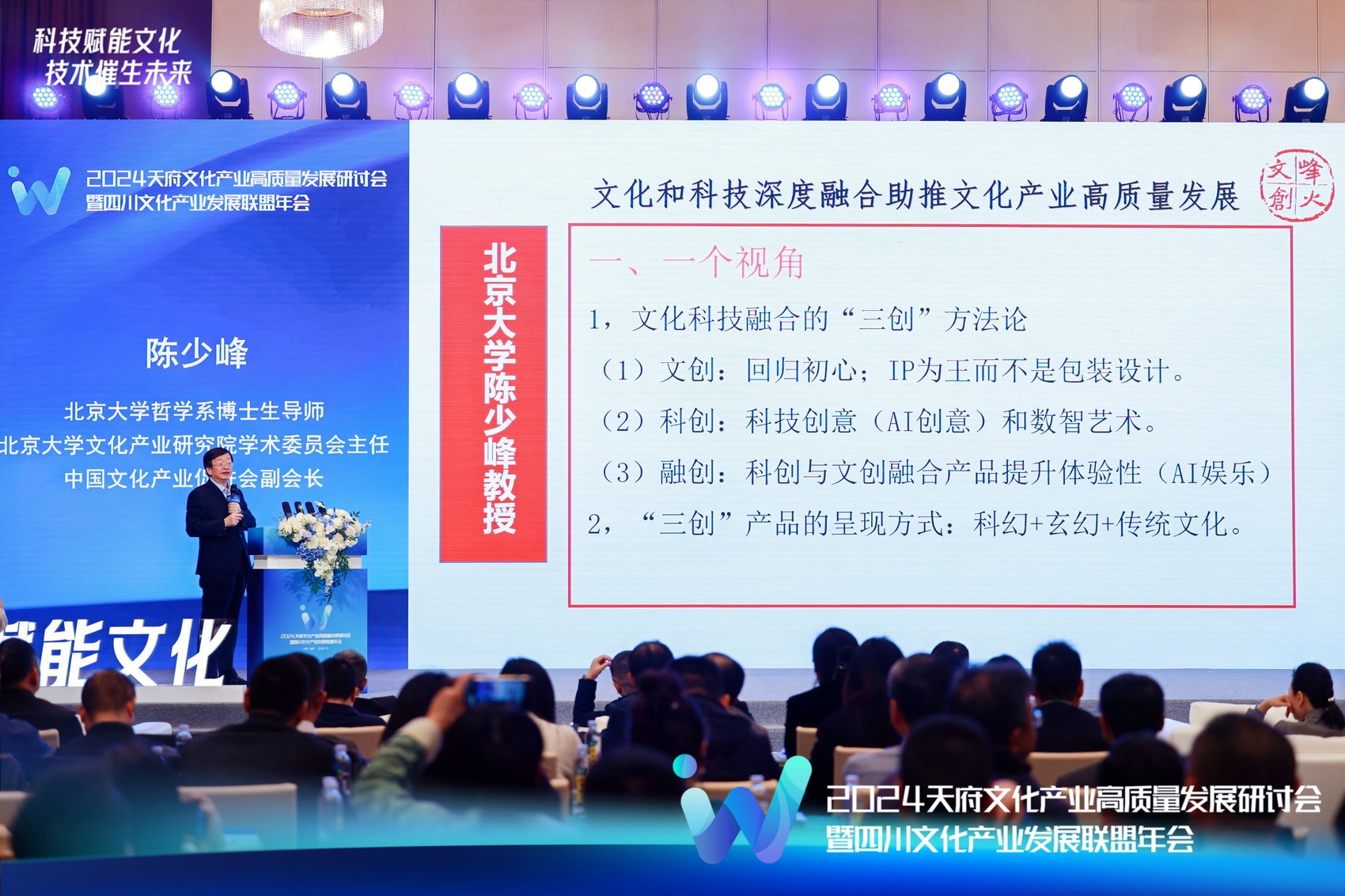 12月5日,以“科技赋能文化,技术催生未来”为主题的2024天府文化产业高质量发展研讨会暨四川文化产业发展联盟年会在成都举行。北京大学哲学系博士生导师、北大文产院学术委员会主任、中国文化产业促进会副会长陈少峰教授作了《文化与科技深度融合助推文化产业高质量发展》的主旨演讲。