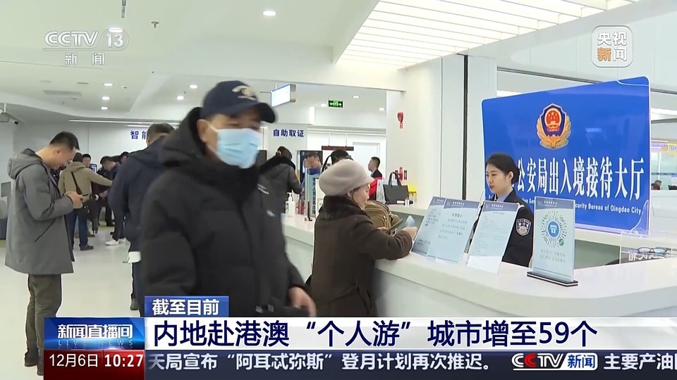 截至目前,内地赴港澳“个人游”城市增至59个,59个“个人游”城市户籍居民及居住证持有人如已办理往来港澳通行证,可通过智能签注设备申请往来港澳个人旅游签注,实现立等可取。