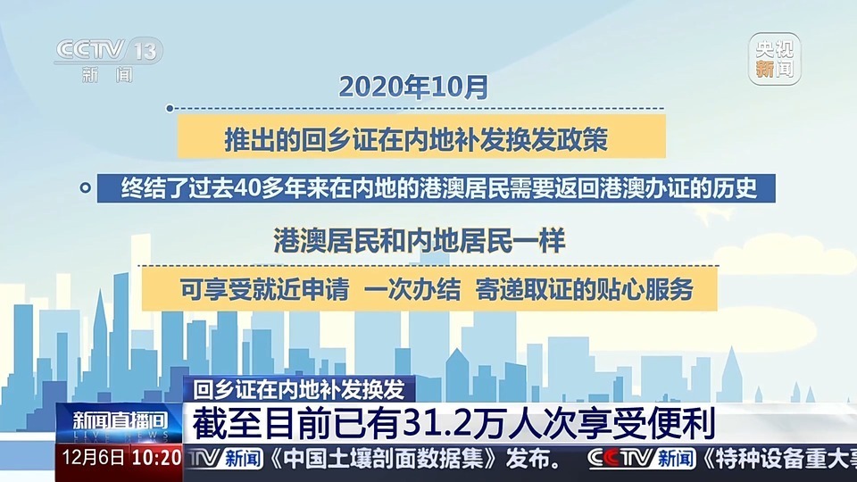 2020年10月,推出的回乡证在内地补发换发政策,终结了过去40多年来在内地的港澳居民需要返回港澳办证的历史,港澳居民和内地居民一样,可享受就近申请、一次办结、寄递取证的贴心服务。截至目前,已有31.2万人次享受便利。