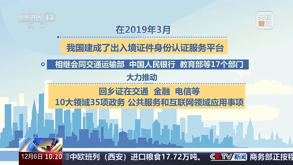 在2019年3月,我国建成了出入境证件身份认证服务平台,相继会同交通运输部、中国人民银行、教育部等17个部门,大力推动回乡证在交通、金融、电信等10大领域35项政务、公共服务和互联网领域应用事项,港澳居民持回乡证在内地实现了“一证在手,顺畅办事、安心出行”。