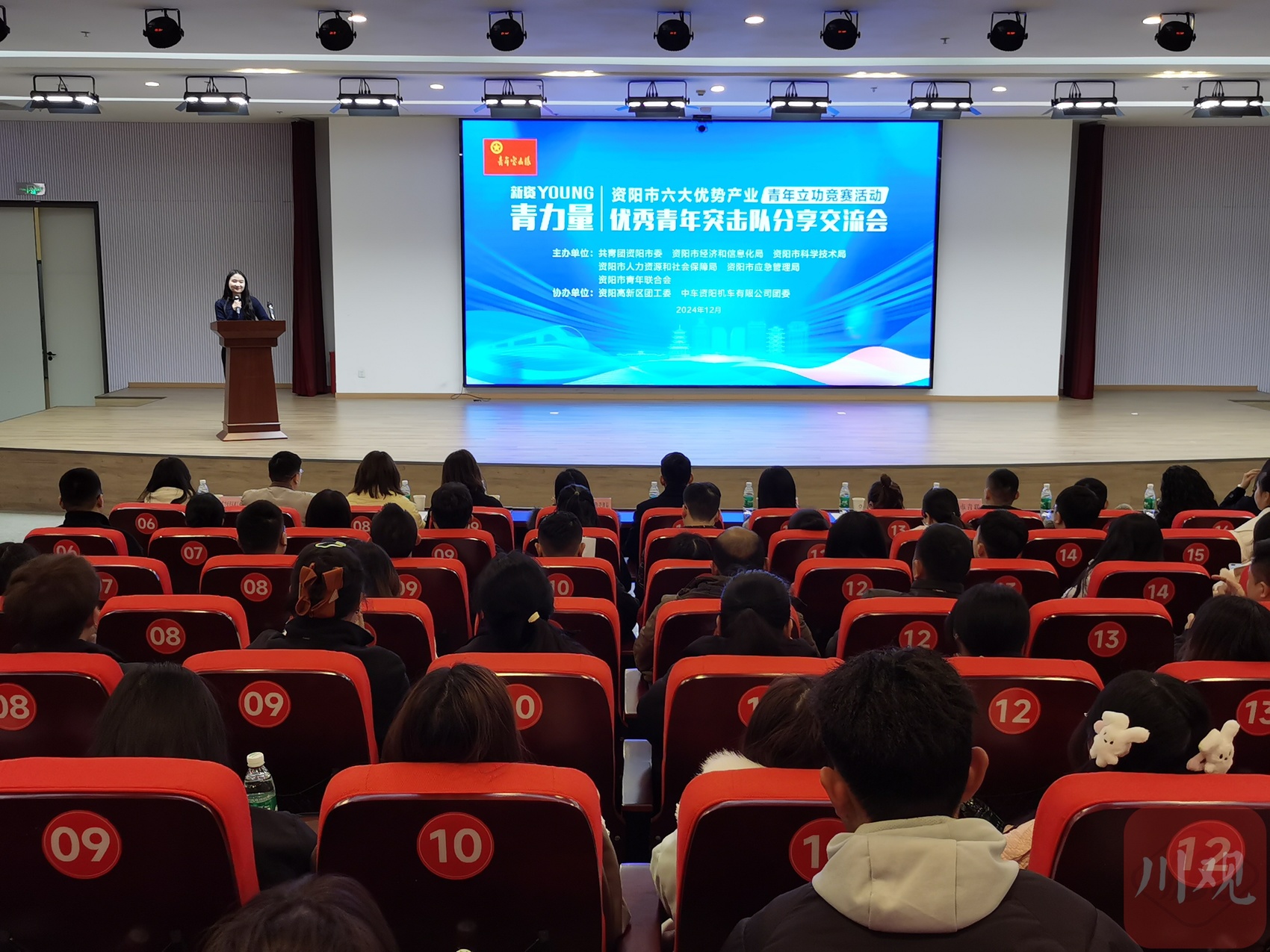 12月6日,资阳市六大优势产业青年立功竞赛活动优秀青年突击队分享交流会上,来自医药健康、装备制造、能源化工、电子信息、先进材料、食品轻纺等特色优势产业的6支青年突击队代表依次上台,分享了他们写在实验室、建设工地、生产车间的青春故事。