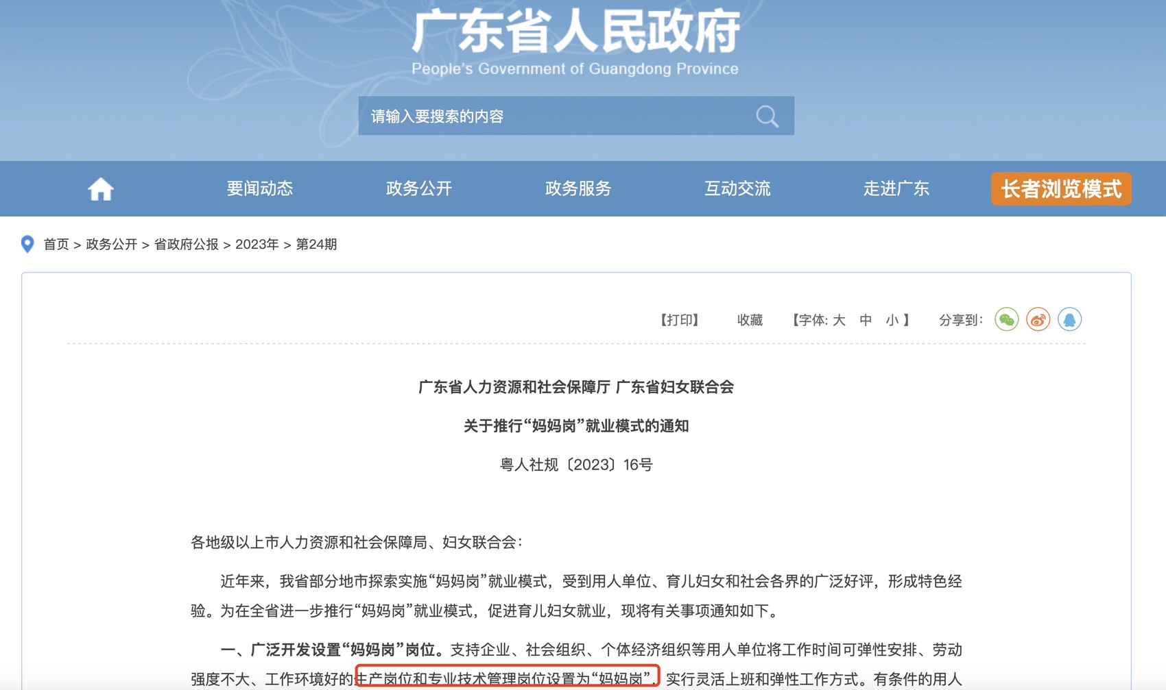 广东省《关于推行“妈妈岗”就业模式的通知》提倡企业拿出部分生产岗位和专业技术管理岗位设置为“妈妈岗”。 网页截图