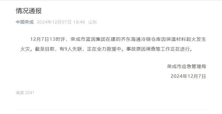 据中国荣成微信公众号消息,12月7日13时许,荣成市蓝润集团在建的齐东海通冷链仓库因保温材料起火发生火灾。截至目前,有9人失联,正在全力救援中。事故原因调查等工作正在进行。