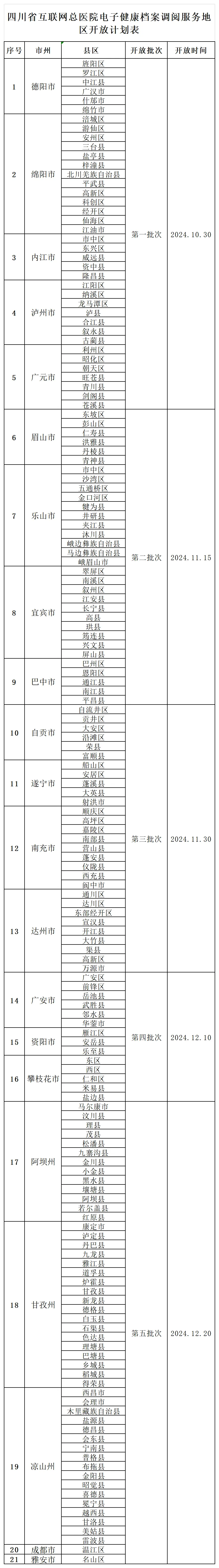 四川省互联网总医院电子健康档案调阅服务地区开放计划表