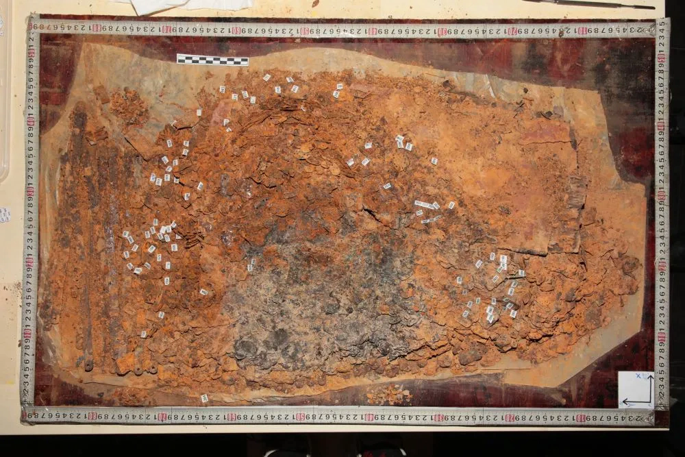 图为套箱提取的海昏侯墓甲片堆积物。江西省文物考古研究院供图
