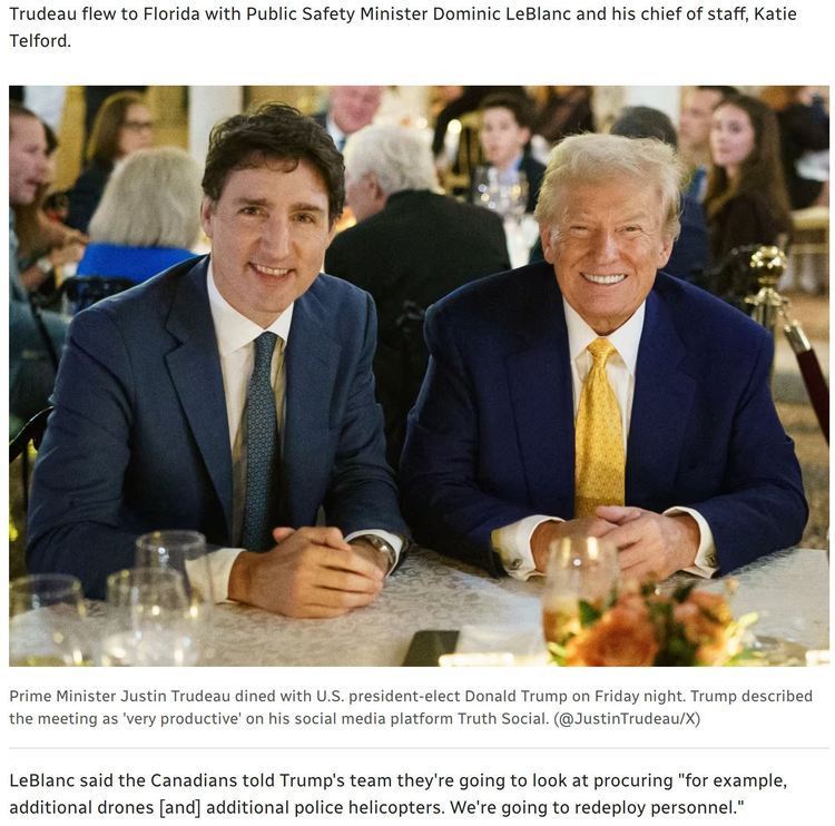 就在特朗普发出加税“预告”后不久,加拿大总理特鲁多亲自飞抵美国佛罗里达州拜会了这位美国候任总统。