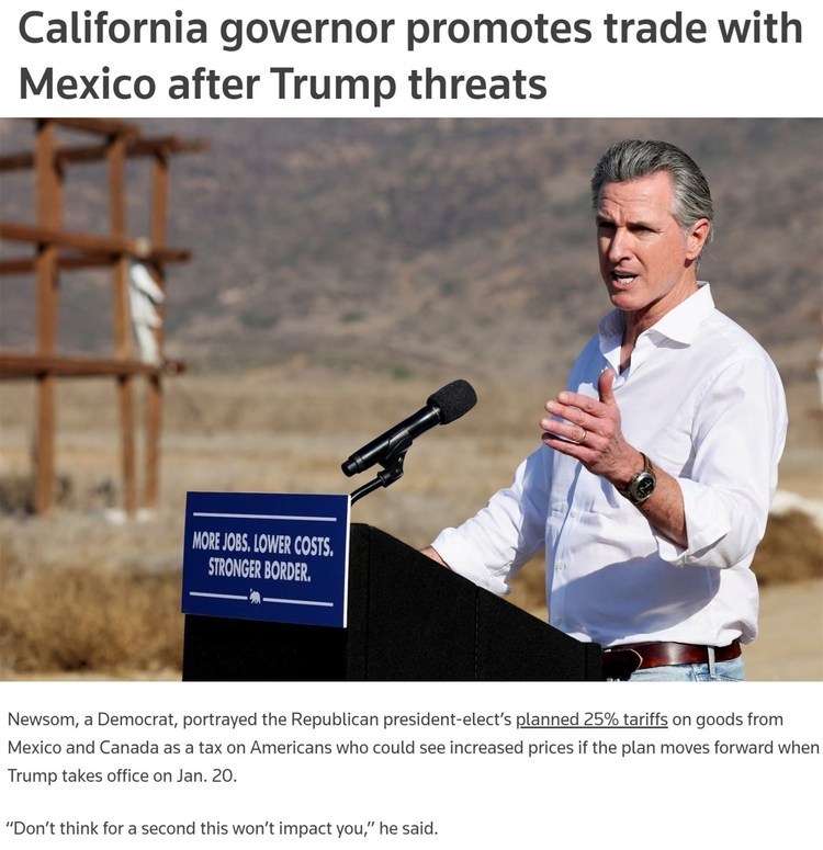 这是美国加利福尼亚州州长加文·纽森针对当选总统特朗普威胁加征进口关税所做出的反应。